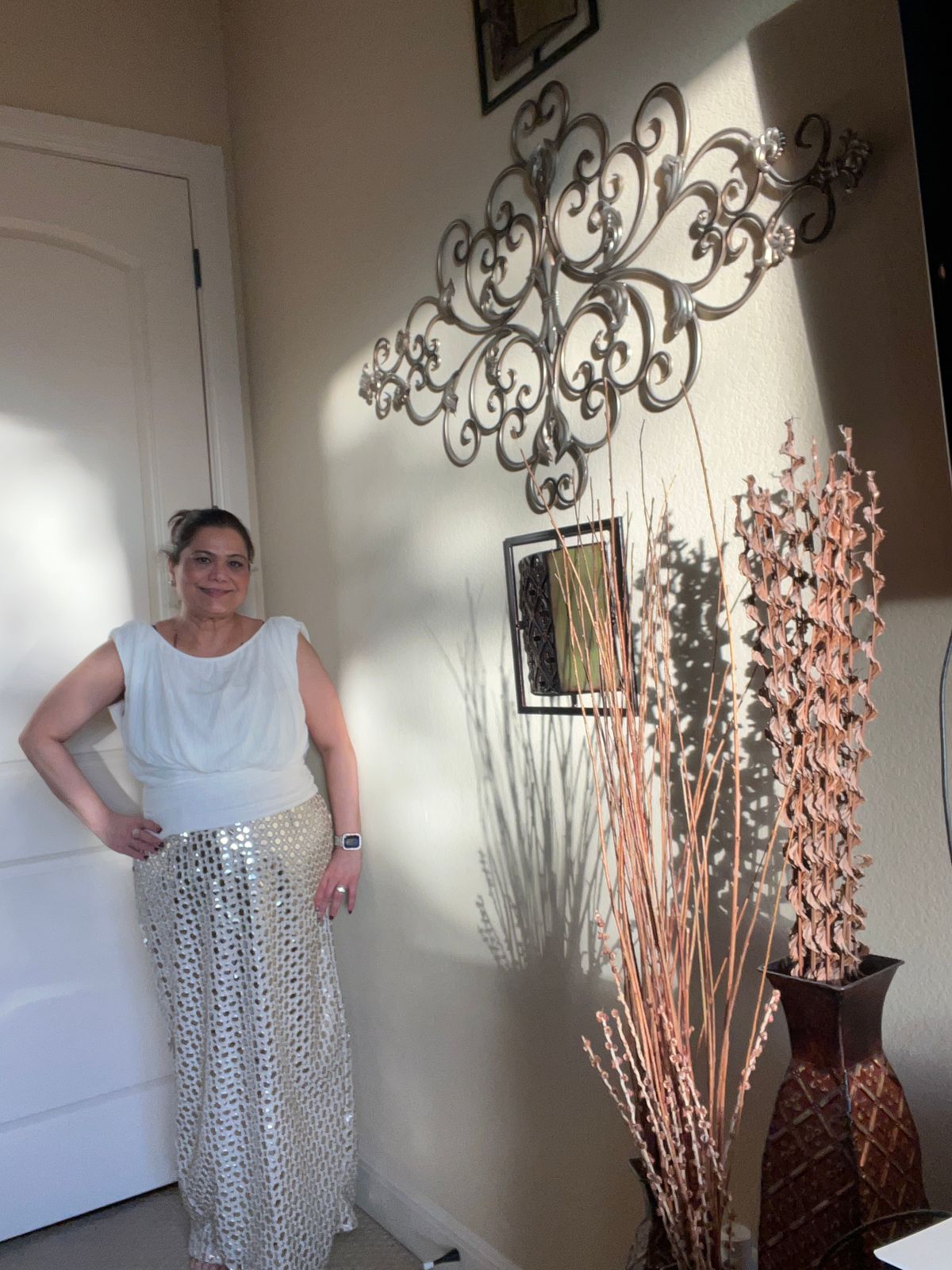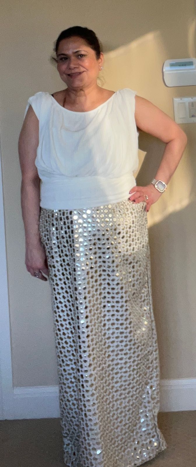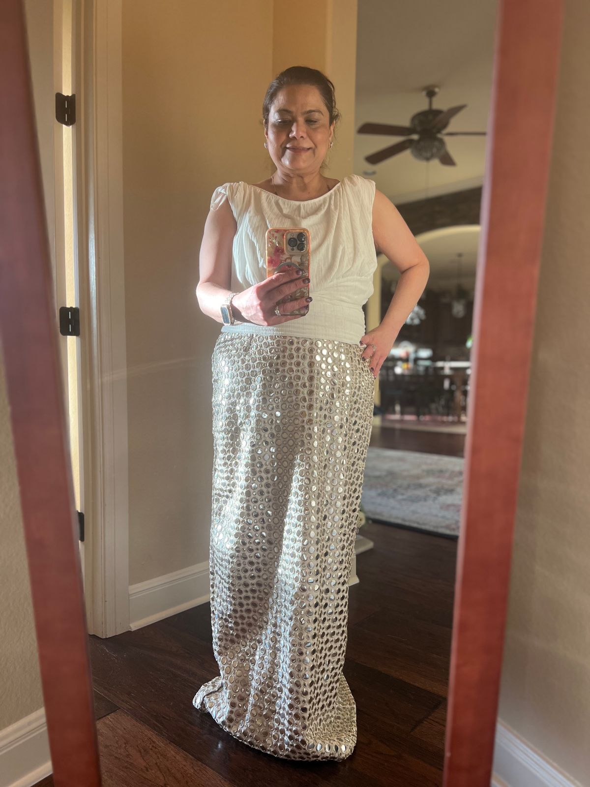 This strapless ivory gown dazzles with all-over foil mirror work embroidery that shimmers with every movement. Designed with an adjustable criss cross tie back and statement tassels. Completed with a sleek dupatta with mixed metal fringe detailing. A perfect blend of modern glamour and timeless elegance.