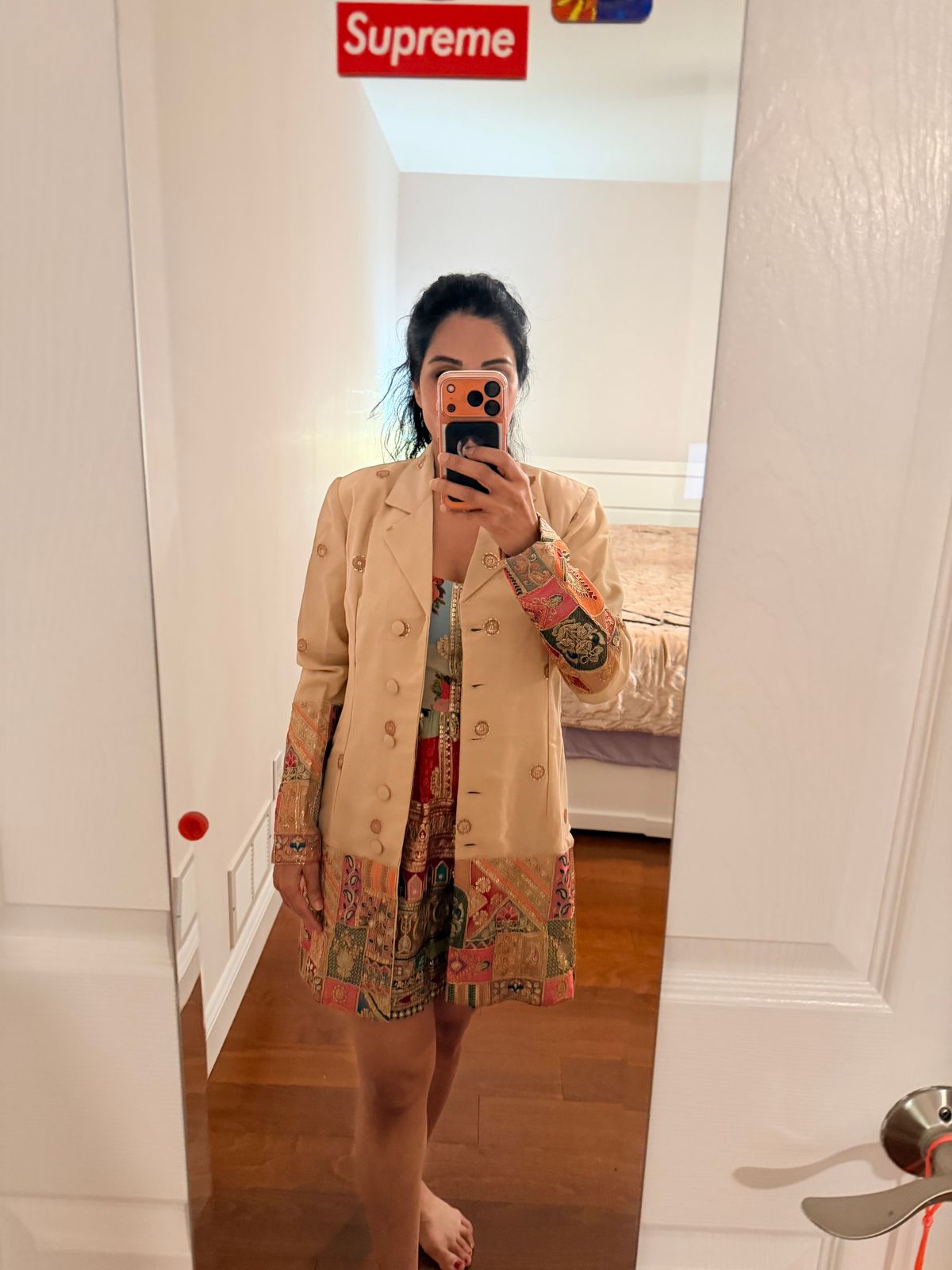 This handmade fully embroidered cream boyfriend jacket duals as a blazer dress and is a true showstopper. With its vibrant design and versatile style, get ready to be best dressed for the occasion.